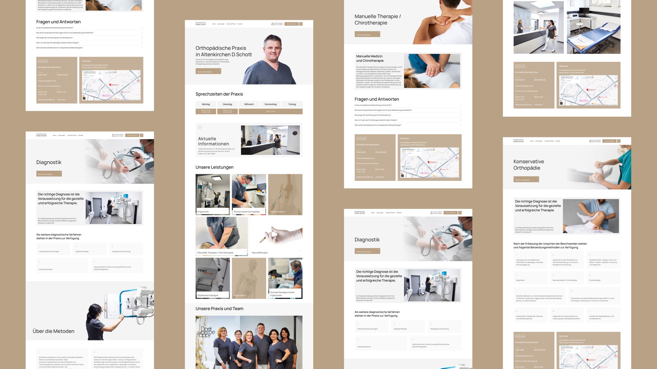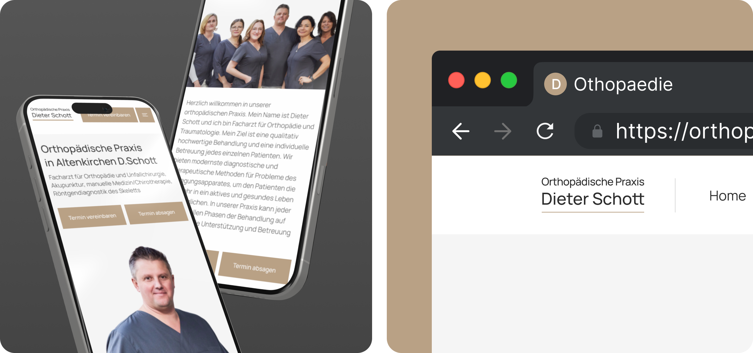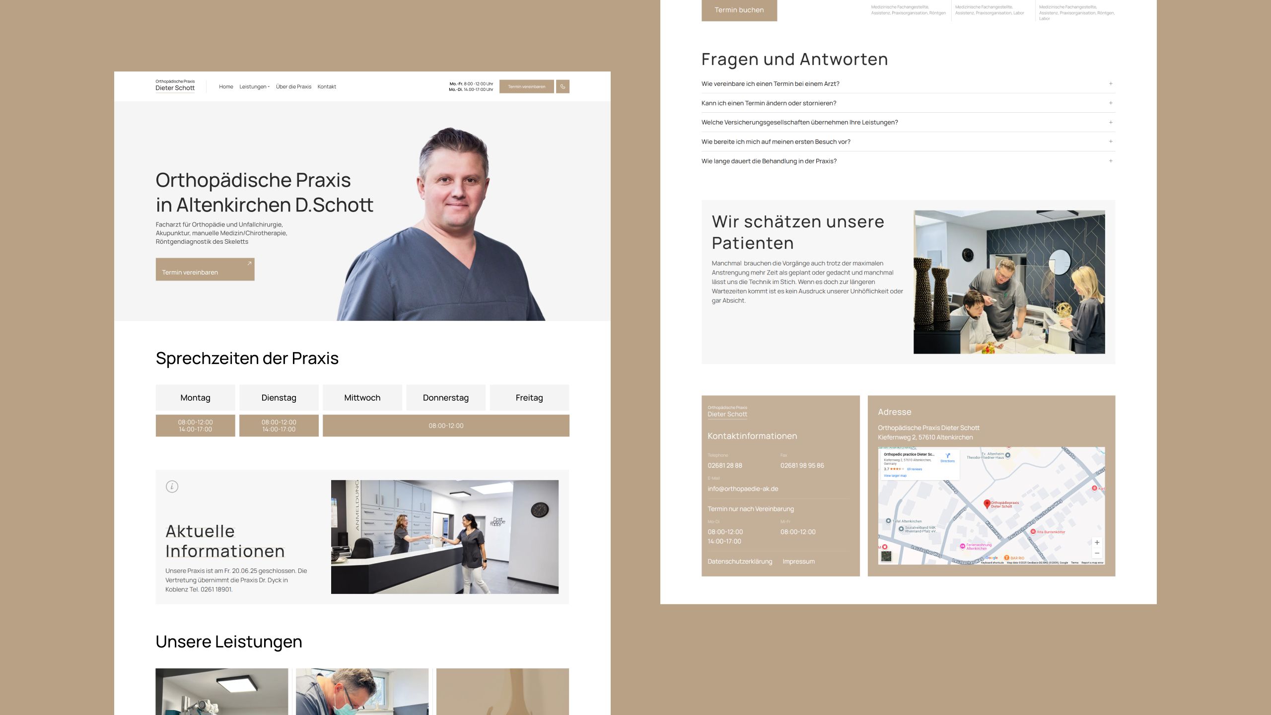 Die Orthopädische Praxis Dieter Schott kam mit dem Wunsch nach einem digitalen Neustart zu uns: Patienten fanden online kaum verlässliche Informationen, das frühere Layout wirkte veraltet. Wir entwickelten eine klare, mehrseitige Plattform auf WordPress + YooTheme Builder, die den ruhigen Beige-Graphit-Look des Corporate Designs übernimmt und den Termin-CTA in den Fokus rückt. Manrope-Typografie, luftige Weißräume und ein Mobile-First-Ansatz beschleunigen die Orientierung – egal ob Desktop, Tablet oder Smartphone. Bereits im ersten Monat sank die Ladezeit auf durchschnittlich 0,9 s, die Zahl der Online-Buchungen stieg um 22%.