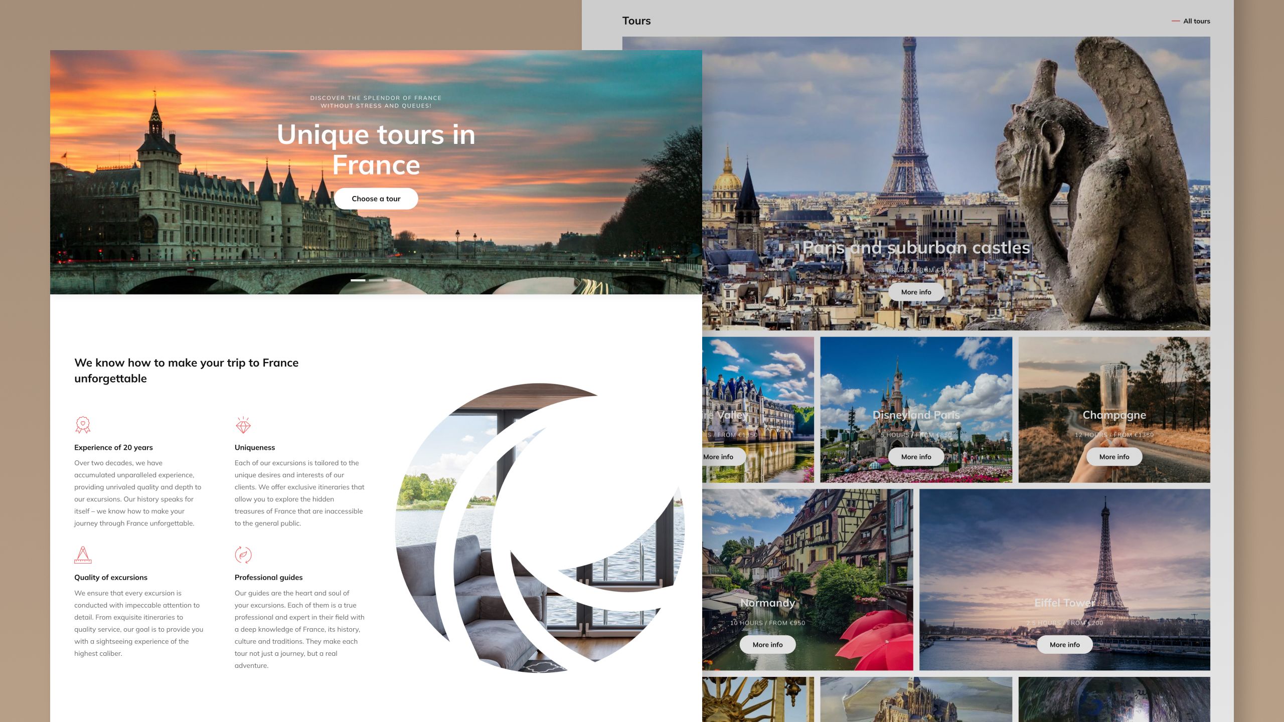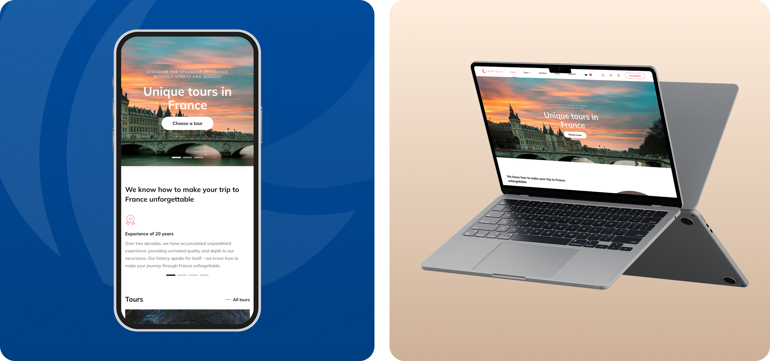 Wir kombinierten französische Eleganz mit maximaler Einfachheit. Basis: WordPress + Gutenberg, ergänzt um Custom-Blöcke, die der Kunde ohne Code anpasst. Ruhige Beige- und Blautöne, große Tour-Cards, sanfter Scroll-Effekt – so entsteht der Eindruck eines Spaziergangs an der Seine. Responsiv von 360 px bis 4 K, CLS < 0,03.