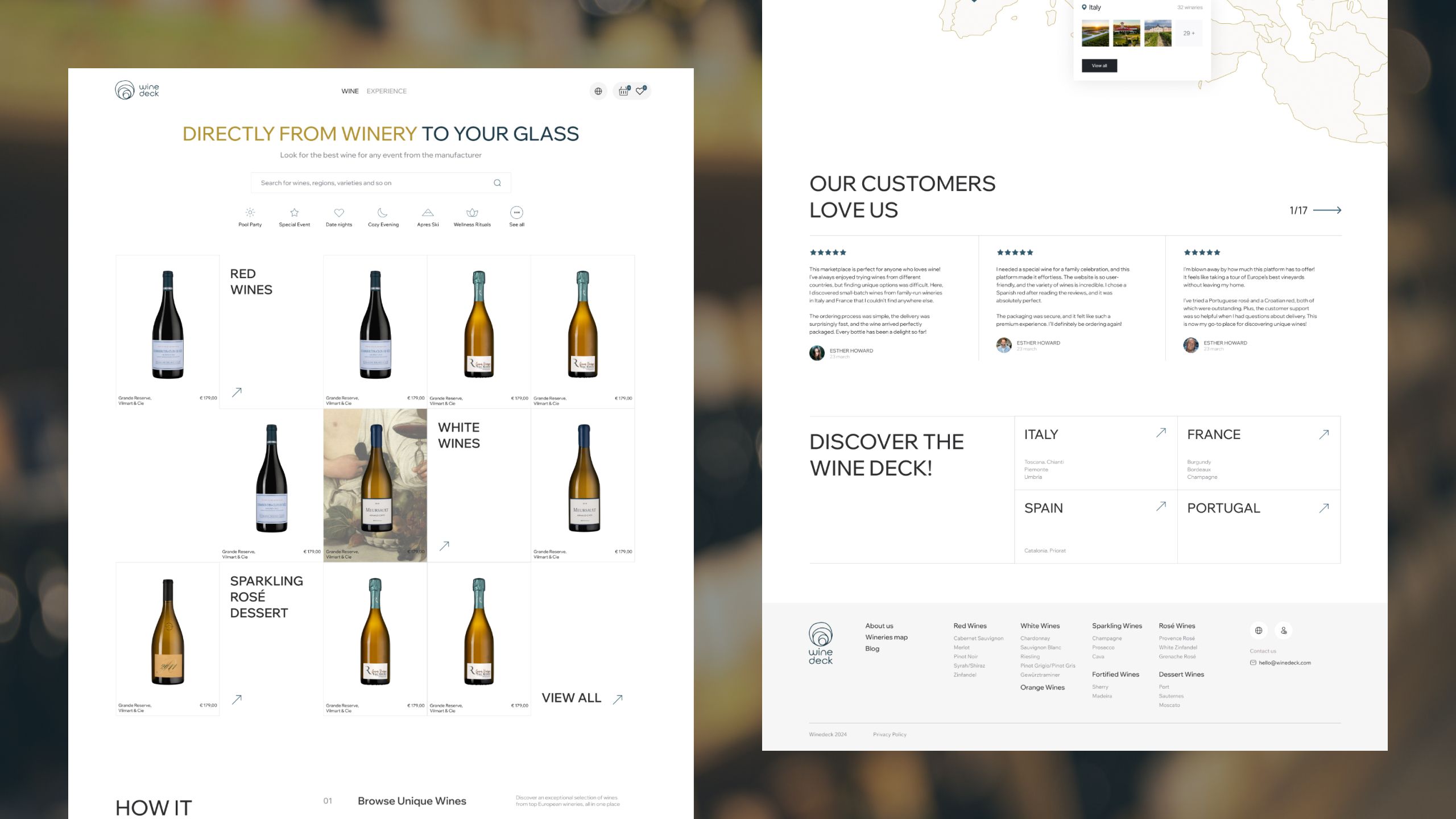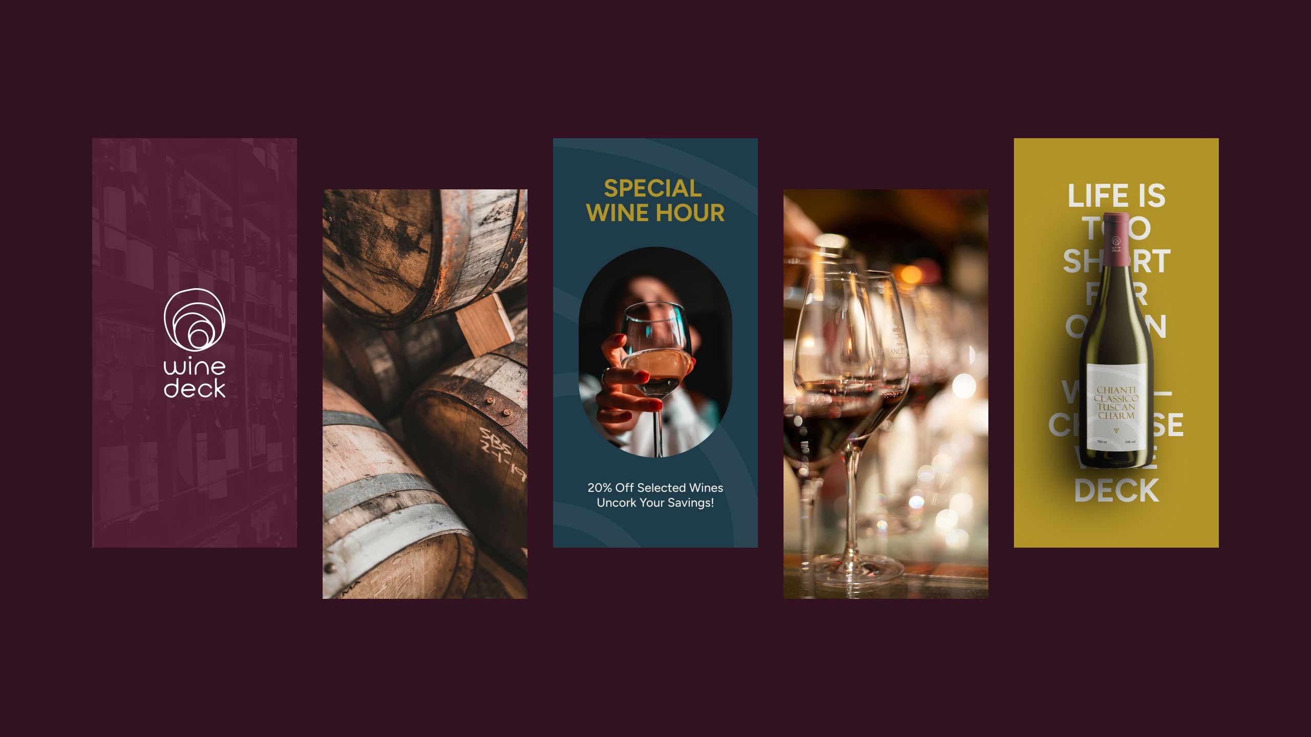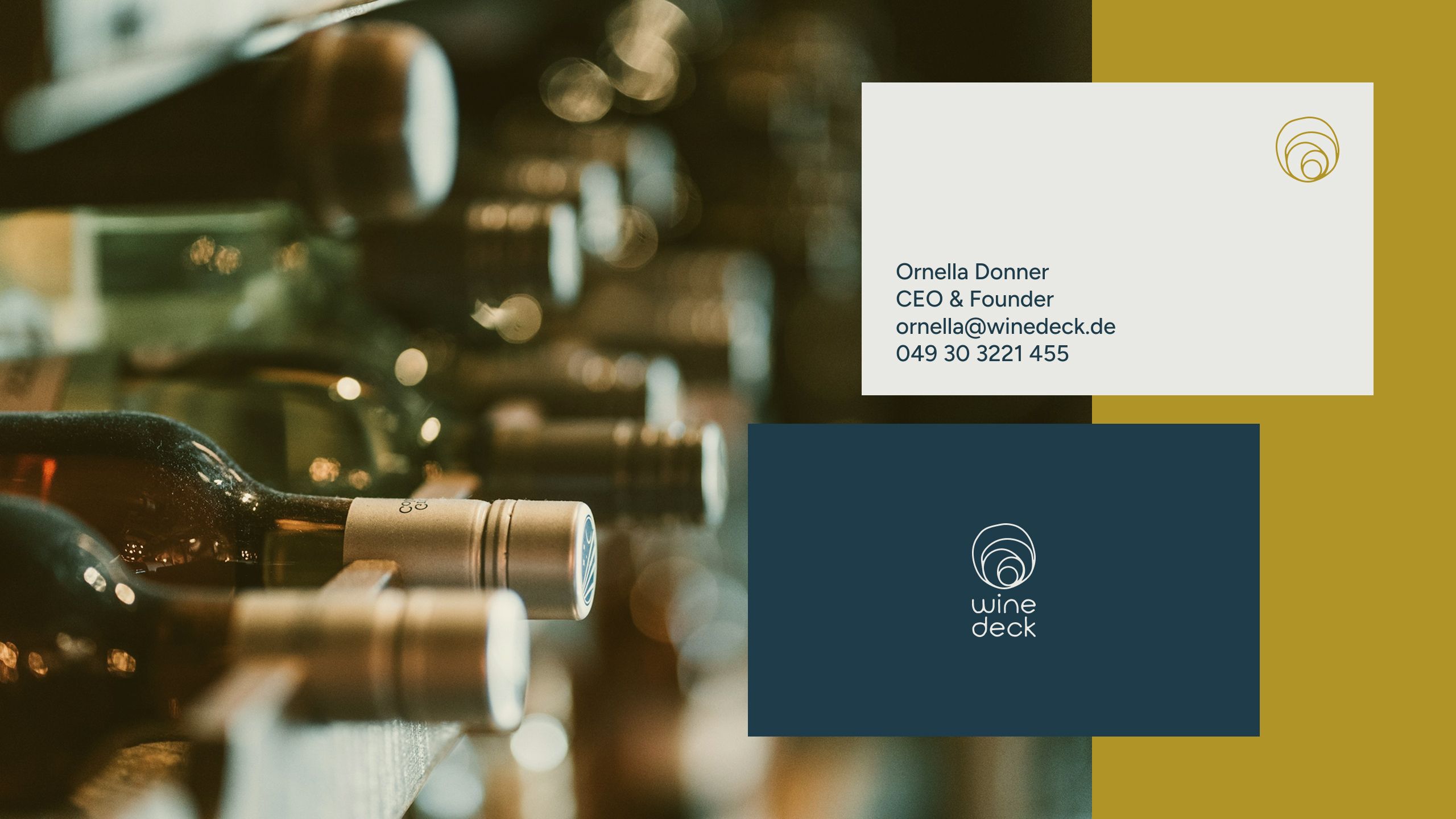 Für Wine Deck haben wir einen vollständigen visuellen Baukasten entwickelt – vom Logo bis zu Werbemitteln und einer Web-Design-Vision. Ziel war es, Retail-Store, E-Commerce-Plattform und Wein-Events unter einer einheitlichen „Degustations-Ästhetik“ zu vereinen. Nach einer fundierten Zielgruppen-Analyse entstand ein flexibles System, das gleichermaßen auf Flaschenetiketten, Event-Tickets und im Online-Katalog überzeugt.
