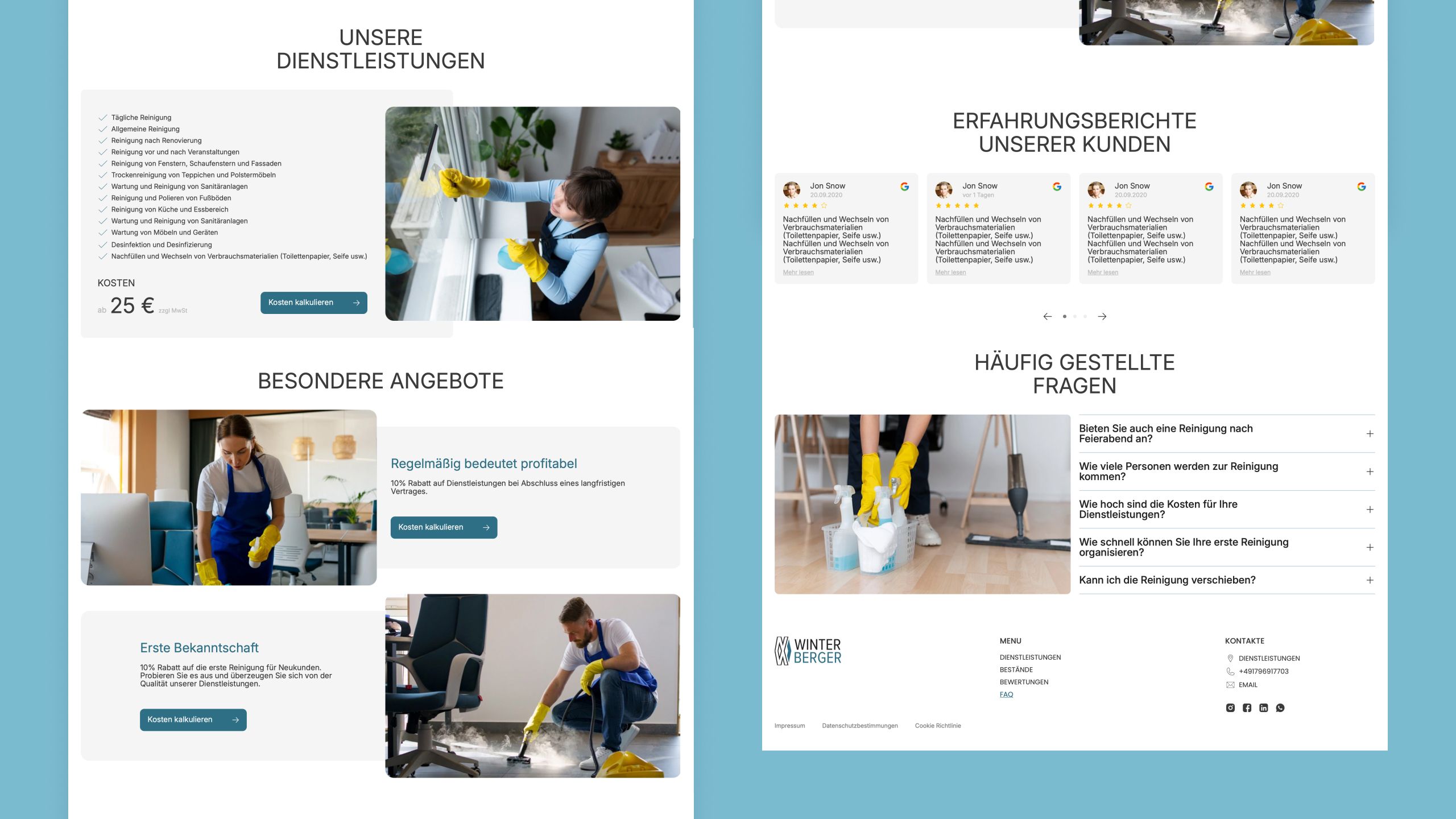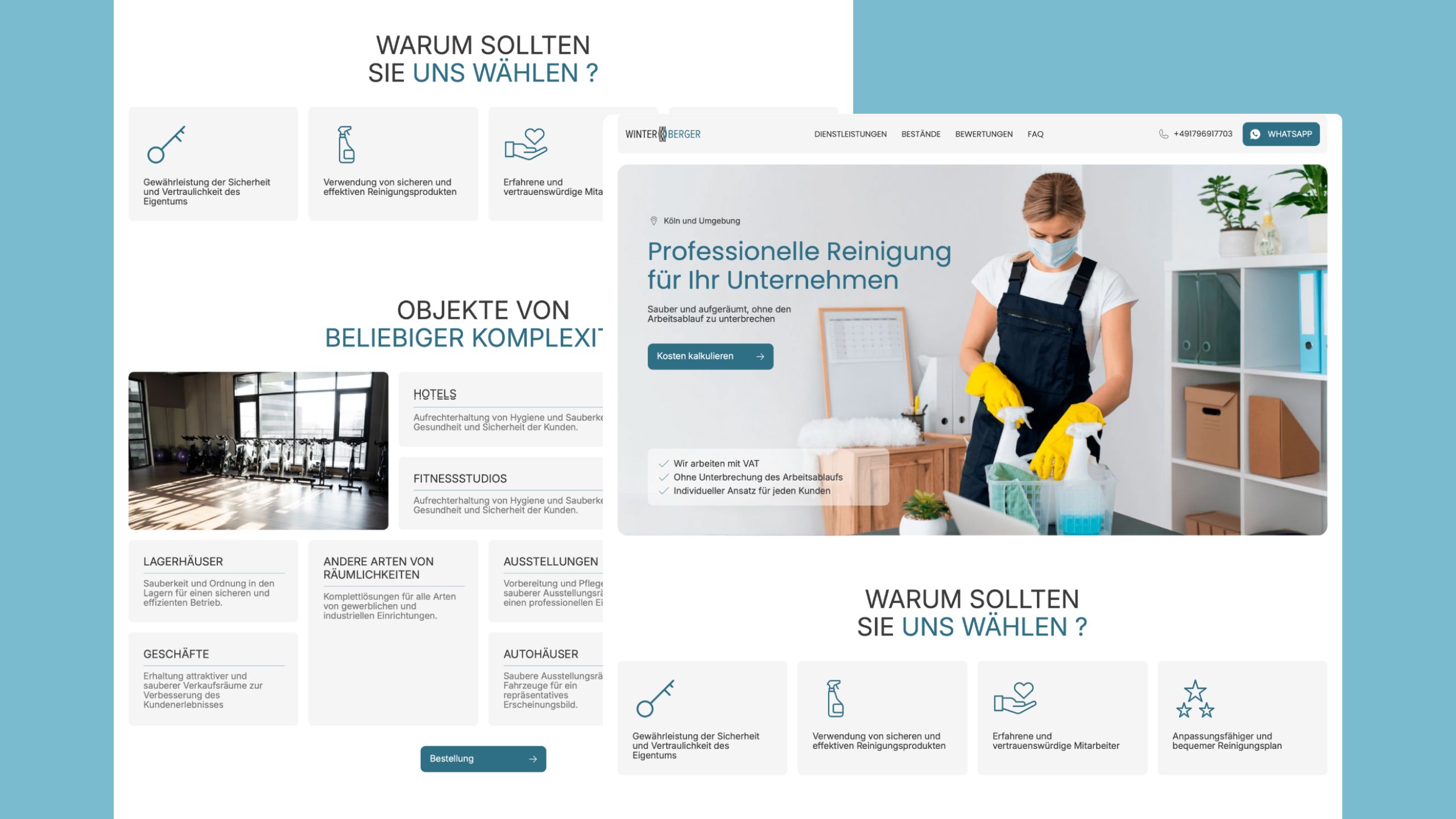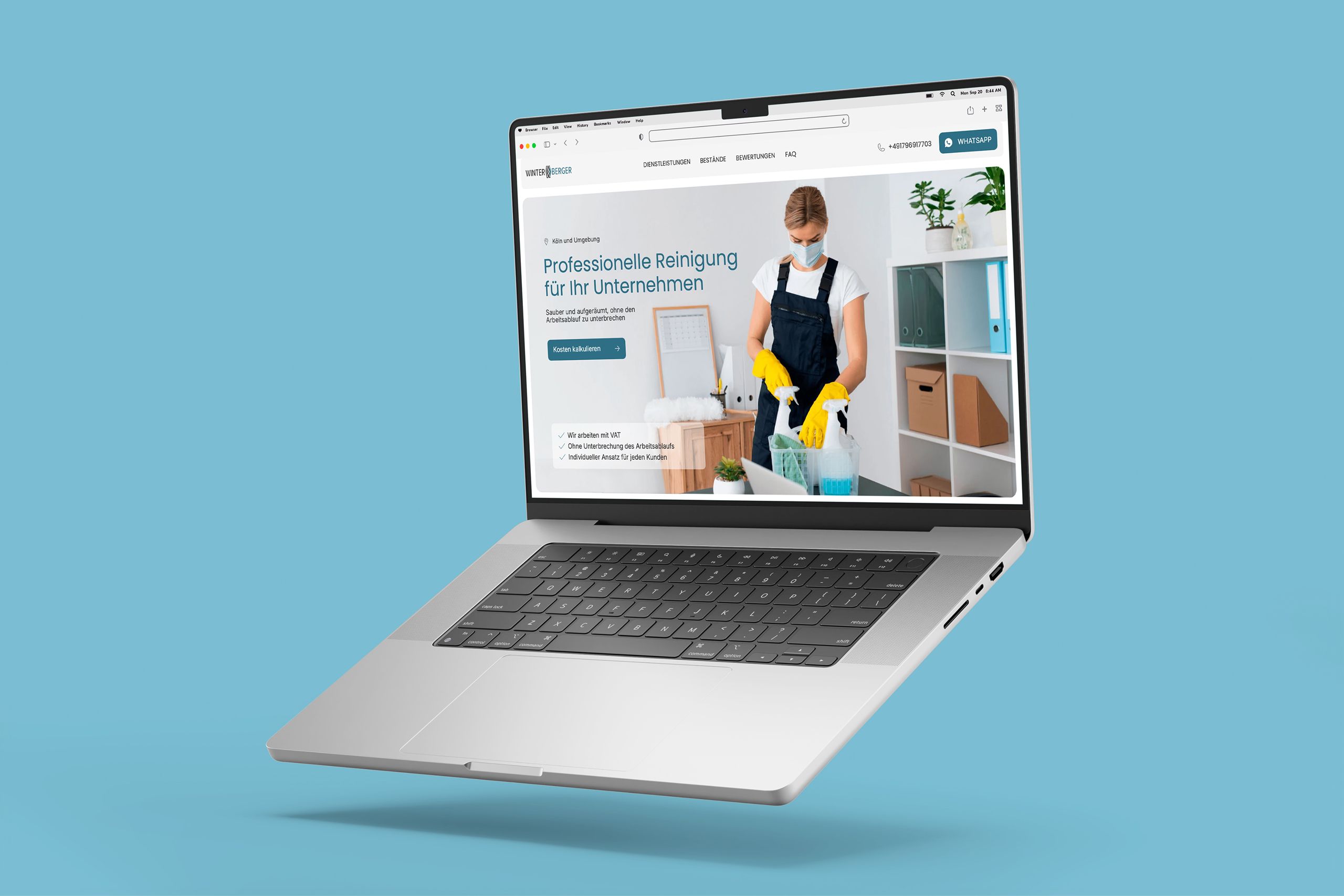 Für Winter Berger entstand eine zeitgemäße Website, die professionelle Büro- und Objektreinigung klar positioniert. Das Projekt startete mit äußerst wenig Ausgangsmaterial, daher übernahmen wir den kompletten Zyklus – von Zielgruppen-Research bis zum abschließenden Testing. Im Mittelpunkt standen transparente Preise, flexible Einsatzpläne und die Expertise des Teams. Ergebnis: eine leichte, intuitiv bedienbare Plattform, die Vertrauen aufbaut und Besucher in Anfragen verwandelt.
