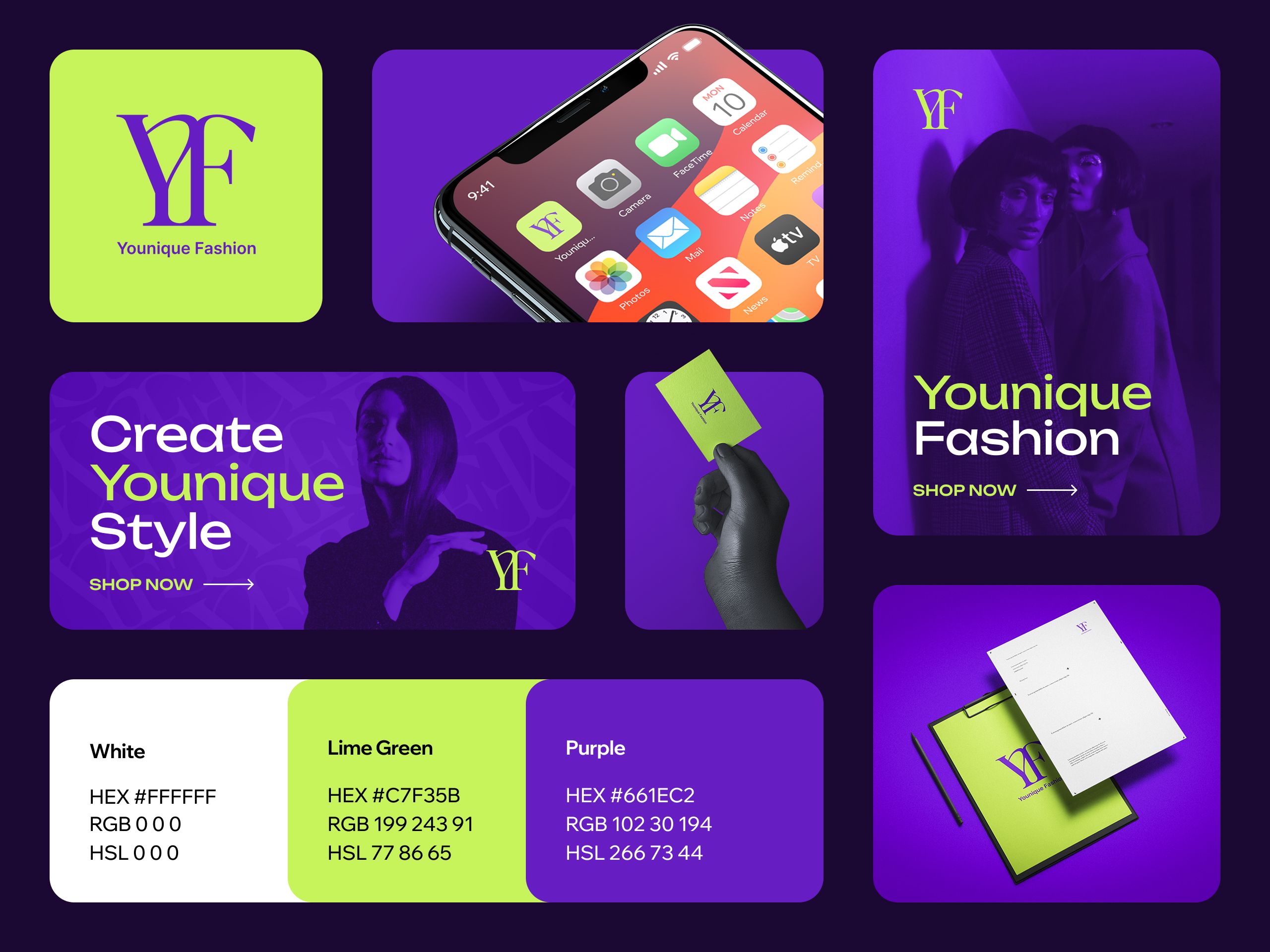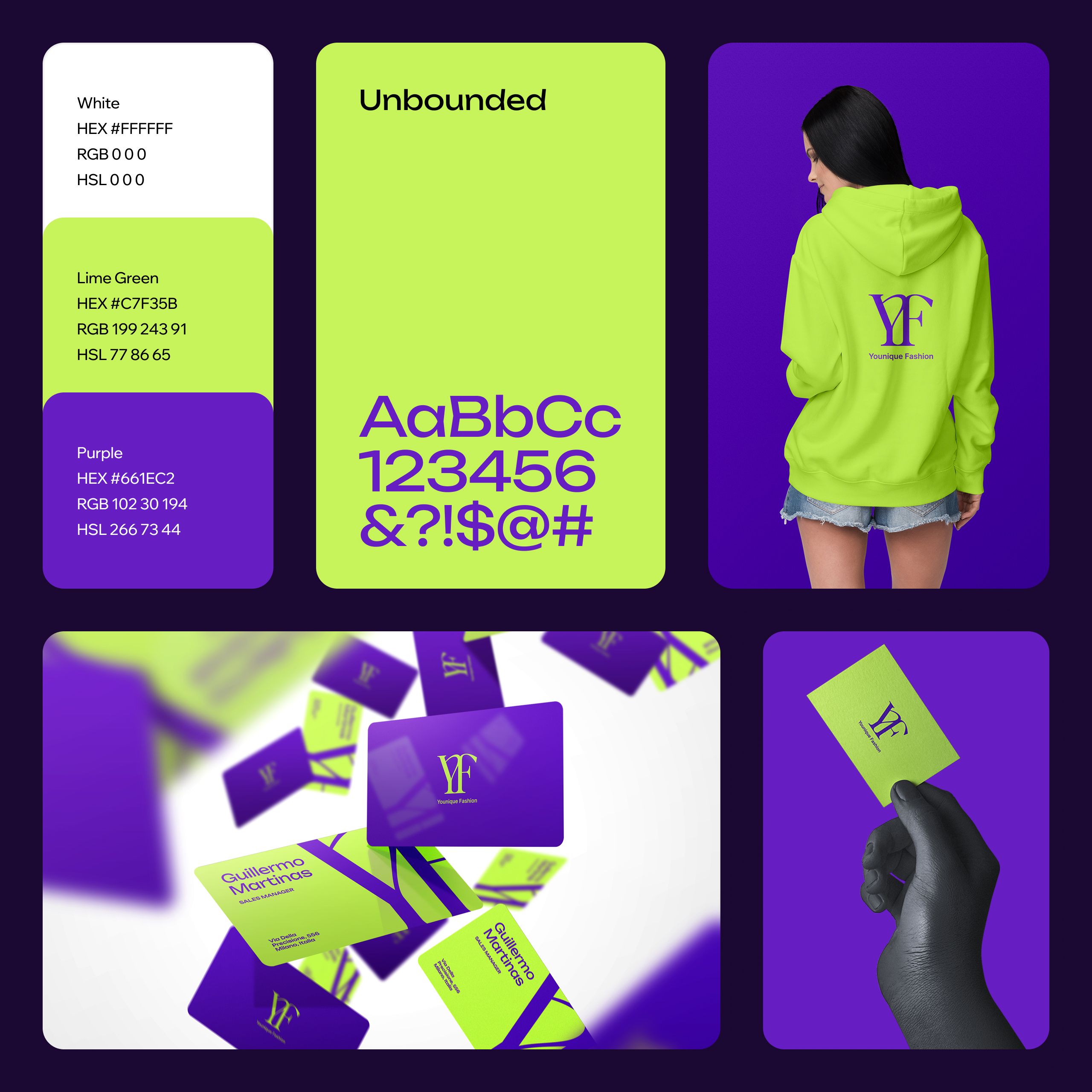 Auf Basis der Insights entstand ein Moodboard und das Positioning-Versprechen „Create Younique Style“. Die Farb-DNA Lime Green #C7F35B / Purple #661EC2 wurde als Wiedererkennungs-Trigger definiert – ein klarer Kompass für alle folgenden Designs.